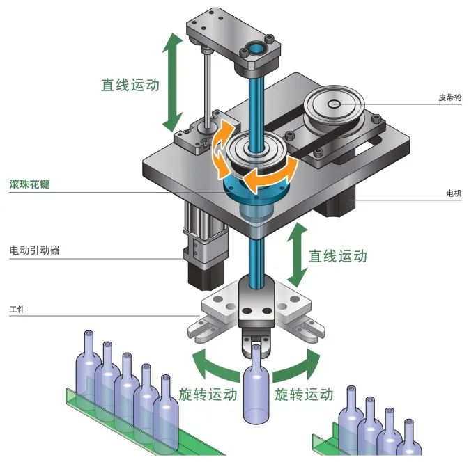滾珠花鍵通過(guò)單軸傳遞扭矩,因此可實(shí)現(xiàn)直線及旋轉(zhuǎn)的組合運(yùn)動(dòng)。