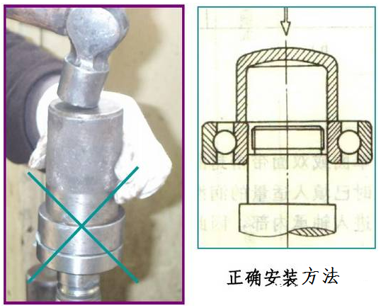 安裝內圈(或外圈)過盈配合的軸承,禁止用鐵錘直接敲擊軸承內圈(或外圈)端面,這樣很容易把擋邊敲壞。應該采用套筒放在內圈(或外圈)端面上,用鐵錘敲擊套筒來安裝。